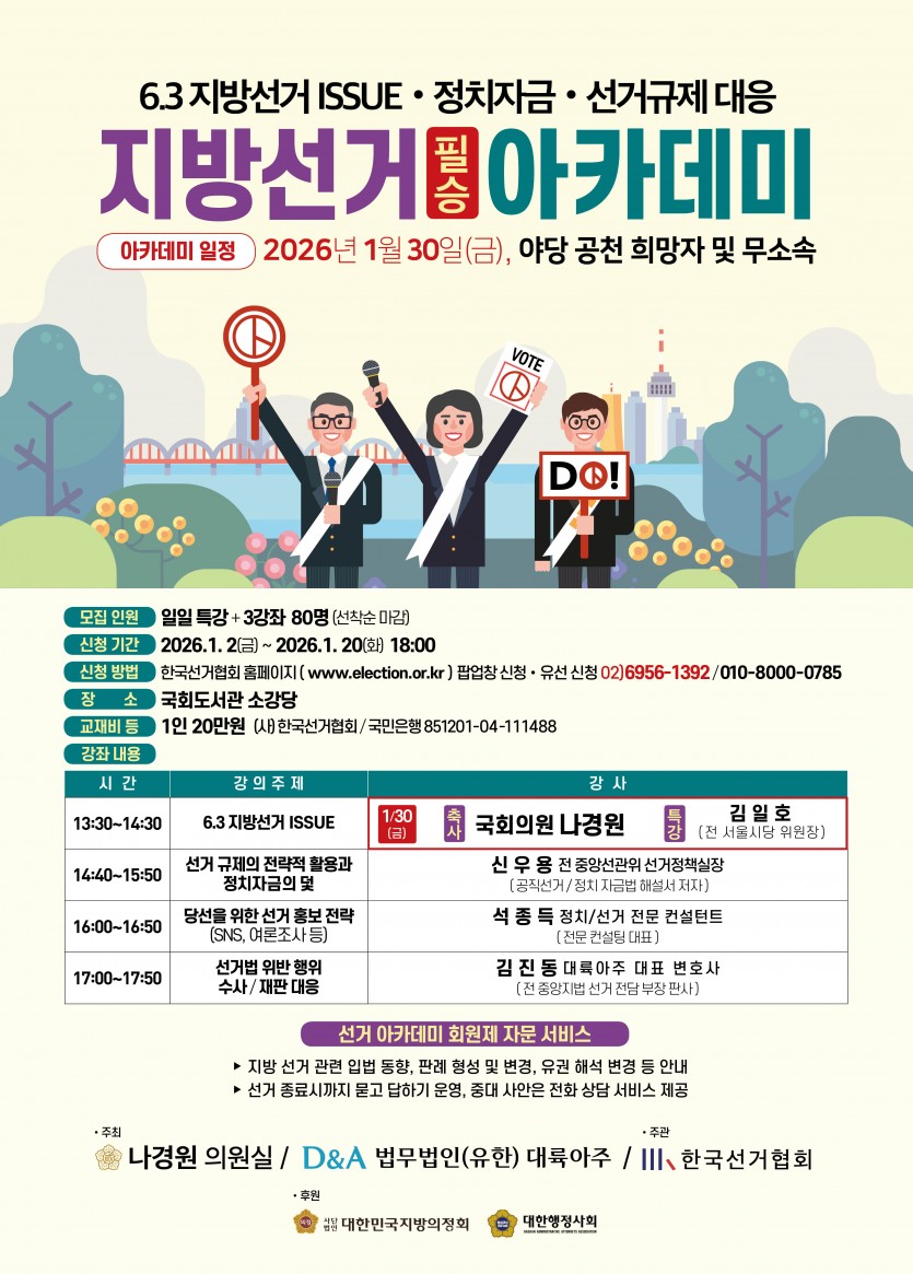 건전한 선거문화 구축을 위해 공익적 사회사업의 일환으로 나경원 국회의원과 법무법인 대륙아주가 공동주최로 아카데미를 개최합니다.